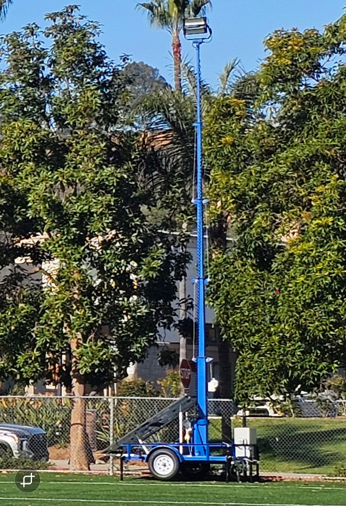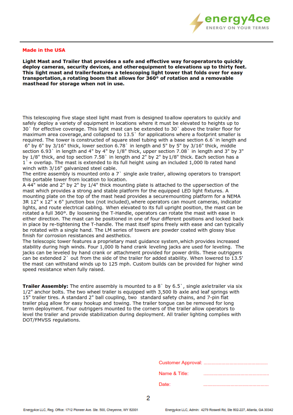 The entire assembly is mounted onto a 7' single axle trailer, allowing transport of this portable tower from location to location. Four outriggers mounted to the corners of the trailer allow efficient leveling of the trailer and provide stabilization during deployment. All trailer hookups and lighting complies with DOT/FMVSS regulations.